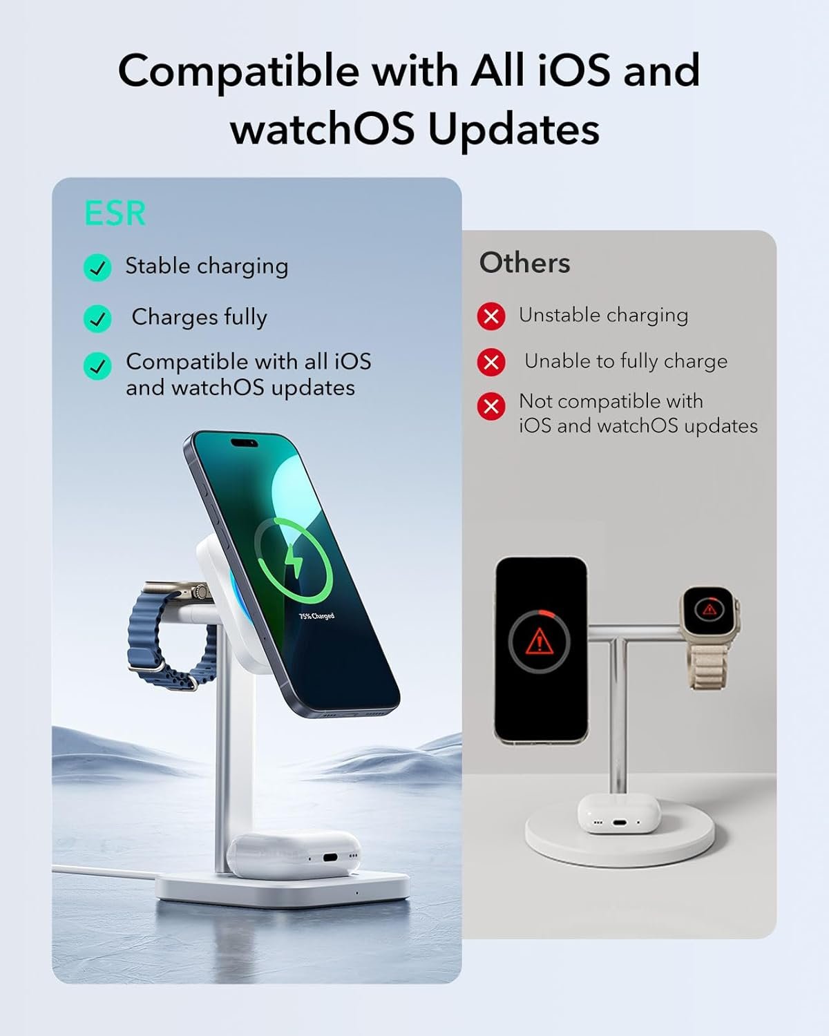 I use this charger daily for my iPhone, Ultra 3, and AirPods Pro 3. It charges each device fully and reliably, with zero issues. The charging slots are intuitively designed, allowing me to add and remove my watch and AirPods easily—no need to worry about the stand tipping over. The magnets are impressively strong, holding my phone tightly in place with no slippage whatsoever.